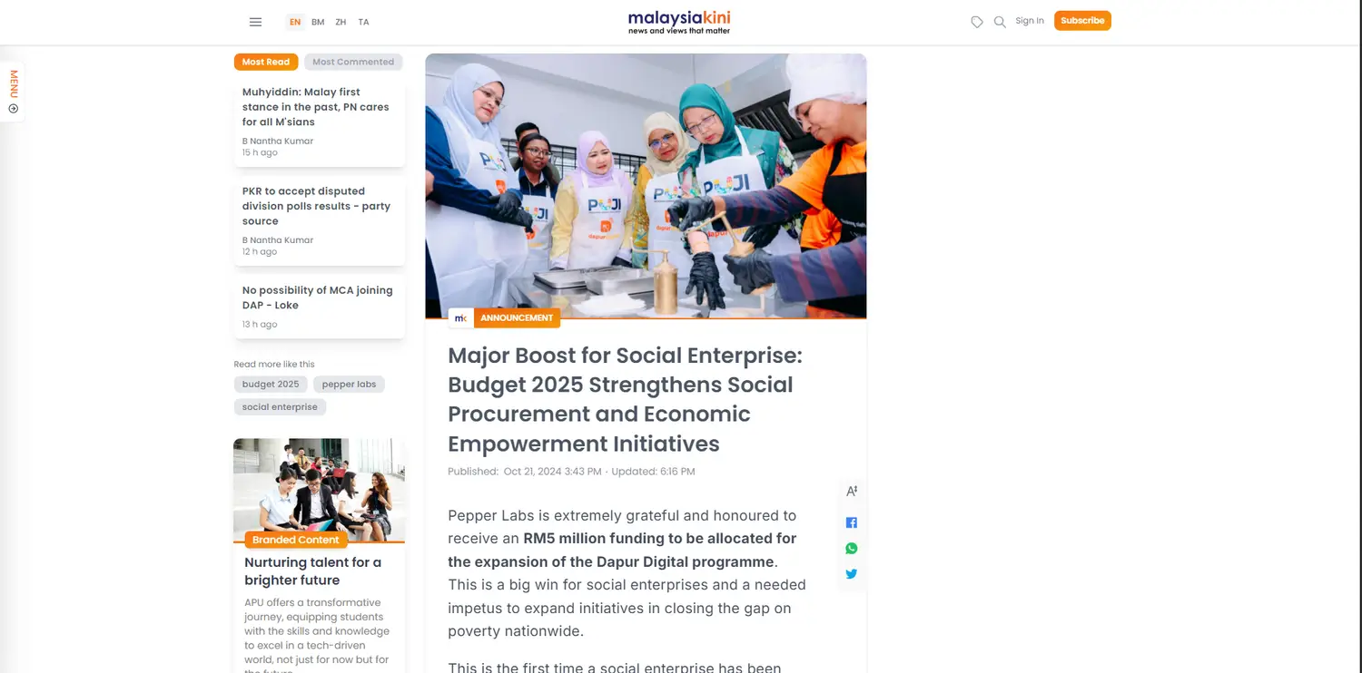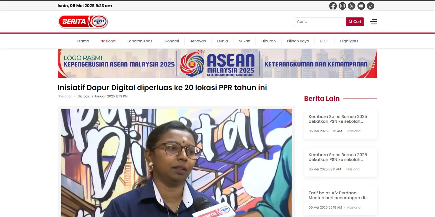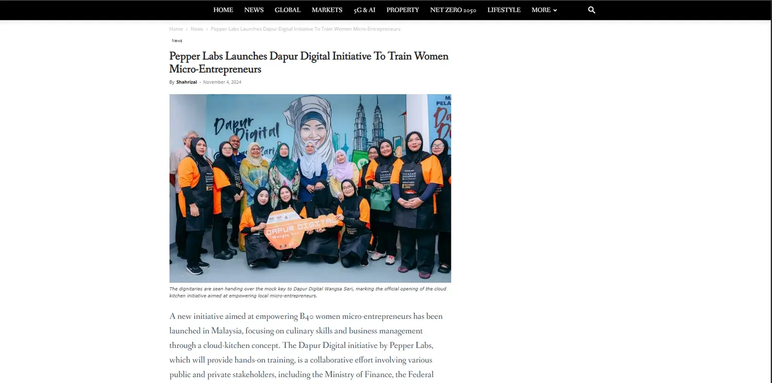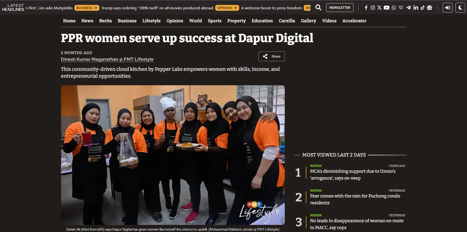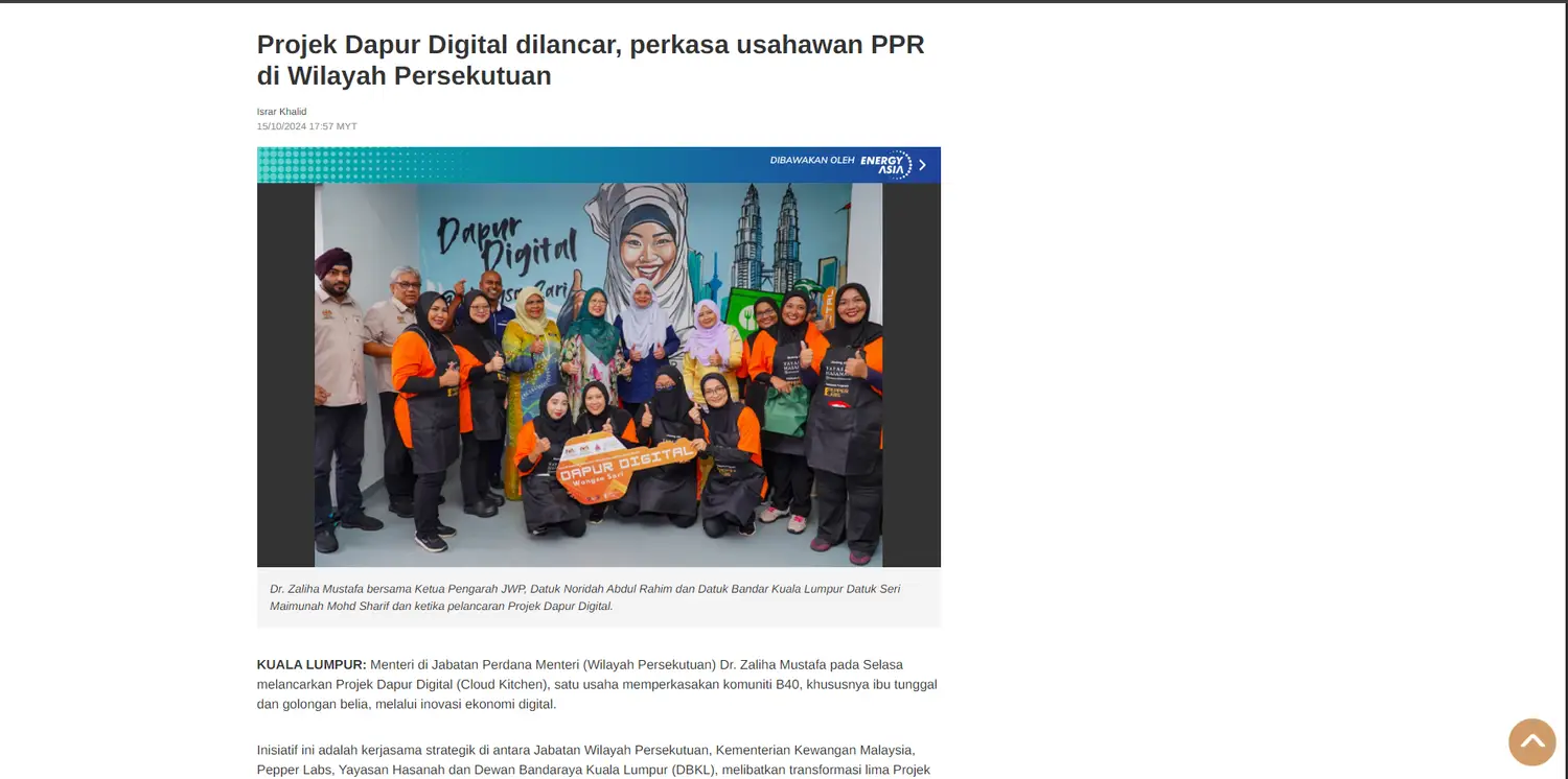 Dapur Digital is a flagship social initiative by Pepper Labs designed to empower B40 micro-entrepreneurs from People Housing Programme (PPR) areas (low-income communities) by providing access to shared kitchen spaces, digital platforms, and essential training. It enables small-scale food vendors to scale their businesses without heavy upfront costs, helping them operate in the digital economy.